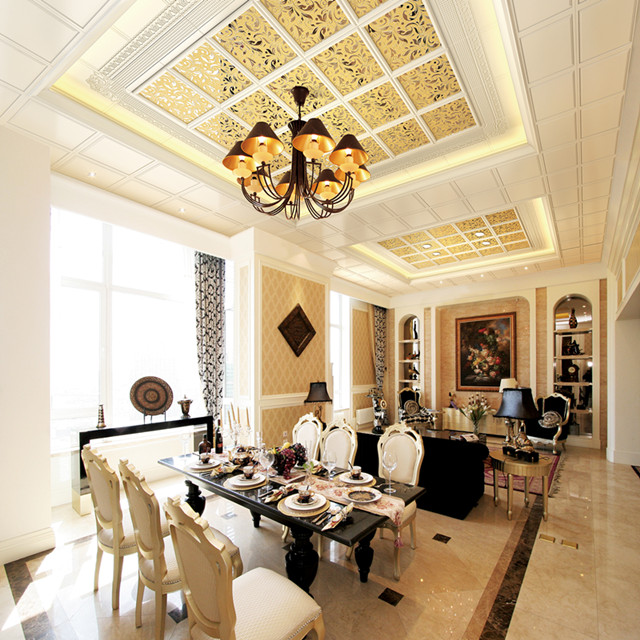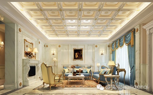 美式古典風(fēng)格在空間上追求連續(xù)性,追求形體的變化和層次感。這個(gè)房間以美式古典宮廷風(fēng)格為主,以復(fù)古的白色和金色為基調(diào)。室內(nèi)外高貴典雅,光影變化豐富。為體現(xiàn)宮廷風(fēng)格,家具、門,窗都漆成白色,藍(lán)色的布藝沙發(fā),金色的畫框壁畫,金色系的地毯,帶有一種異域的視覺沖擊。用壁爐的造型打造的電視柜使得一家人看電視時(shí)的感覺更為溫馨。
