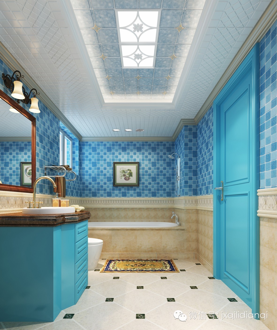衛(wèi)浴間的設(shè)計(jì)也是非常清爽,在追求時(shí)尚個(gè)性的今天,人們對(duì)于家居的裝修上也非常講究獨(dú)特性。無論浴室是大是小,只要通過悉心的打扮,便可以凸顯另一番如畫的風(fēng)景。衛(wèi)浴間運(yùn)用清爽的藍(lán)色,黃色的浴缸外邊更是顯示了地中海的風(fēng)格,色調(diào)不一的藍(lán)色墻磚和頂上的淺藍(lán)吊頂遙相呼應(yīng),猶如藍(lán)色海洋,在這樣的藍(lán)色環(huán)境下泡澡,別有一番風(fēng)味。