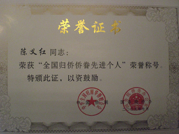 我司陳義紅博士出席代表大會,并被評為全國歸僑僑眷先進個人。