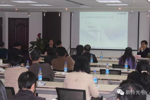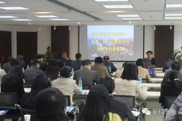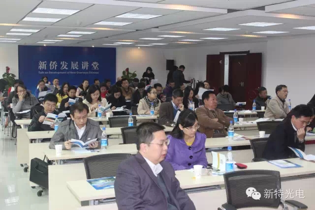 “新僑發(fā)展講堂”于上于2014年11月11日上午9:00在新特光電工業(yè)園內(nèi)為僑服務(wù)中心開講,武漢市僑聯(lián)主席秦峰致開講辭,武漢市科技局副局長趙峰、 武漢市科技局調(diào)研員李和宇為我們解讀“武漢創(chuàng)新發(fā)展的現(xiàn)狀、前景及對創(chuàng)新型企業(yè)發(fā)展的扶持政策”,深度介紹武漢市有關(guān)科技項目的申報、評審,為申請武漢市 的科技項目答疑解惑,幫助新僑專業(yè)人士獲得政府科技基金支持!