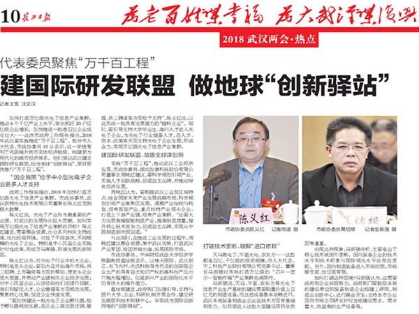 政府工作報(bào)告提出,2018年加快打造萬(wàn)億級(jí)光電子信息產(chǎn)業(yè)集群。市政協(xié)委員、武漢新特光電技術(shù)有限公司董事長(zhǎng)陳義紅受到極大鼓舞。