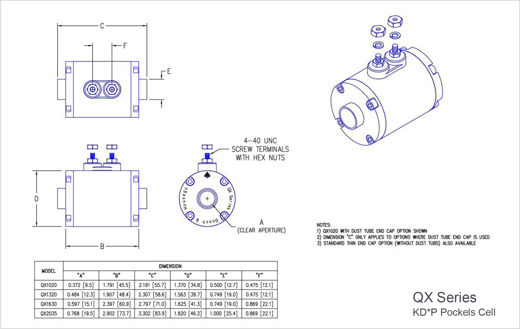 QX系列KD*P普克爾盒在300–1100nm波長范圍內工作,有效孔徑為9.5–19.5mm,重復頻率高達3kHz。在1064nm處提供大于2000:1的電壓對比度。QX系列為KD*P普克爾盒設定了標準,采用寬帶、高損傷閾值溶膠凝膠增透膜及緊湊型設計,以提高耐用性和性能,具有堅固的陶瓷孔徑和優(yōu)質的紫外級熔融石英窗口,可實現(xiàn)高透射率和對比度。
