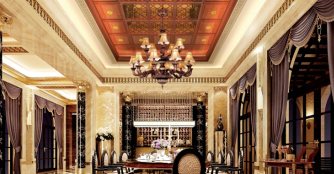 古典韻味十足的中式吊頂,為餐廳空間增添一份素雅與愜意。棕色線條在頂部來(lái)去自如,打造出一個(gè)顏值爆表的餐廳空間。