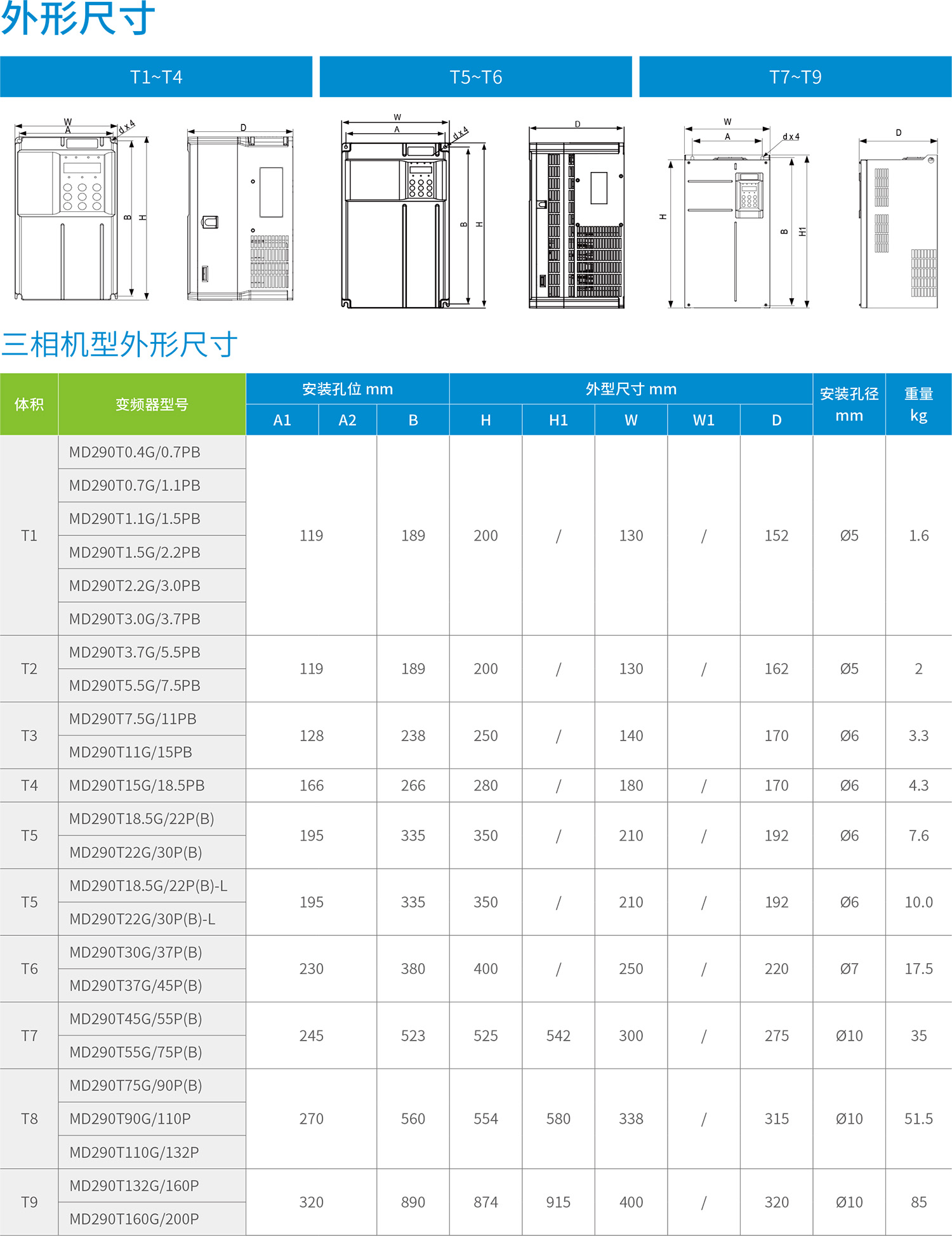 | 型號 | MD290T0.4G/ 0.7PB | MD290T0.7 G/1.1PB | MD290T1.1G/ 1.5PB | MD290T1.5G/ 2.2PB | MD290T2.2 G/3.0PB | MD290T3.0G/ 3.7PB | ||||||||