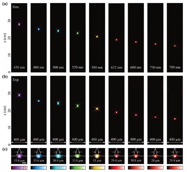 最后,我們將討論平面透鏡在可見(jiàn)光范圍內(nèi)的寬帶性能。我們用圖 4 中提到的更大規(guī)模的平面透鏡來(lái)演示這一問(wèn)題。圖5a、b分別以數(shù)值和實(shí)驗(yàn)方式顯示了在430nm和780nm之間的可見(jiàn)光波長(zhǎng)下的寬帶聚焦特性。這些圖顯示了光場(chǎng)沿傳播距離的強(qiáng)度分布。圖中顯示所有波長(zhǎng)的入射光束在平面透鏡后都表現(xiàn)出明顯的衍射聚焦效應(yīng)。由于平面透鏡的色散,焦點(diǎn)位置的移動(dòng)幾乎與照明波長(zhǎng)的倒數(shù)成線(xiàn)性關(guān)系。隨著光源波長(zhǎng)的倒數(shù)而移動(dòng),而焦斑的大小基本保持不變。當(dāng)波長(zhǎng)從780到430nm時(shí),可見(jiàn)光可以聚焦到zf=15到28.9cm的軸向位置,這一點(diǎn)值得評(píng)估。
