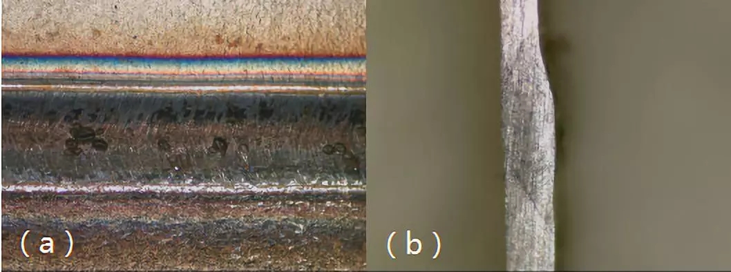 圖4(a)為焊縫正面,放大倍數(shù)20倍,焊縫寬度約1.1mm。焊接過程采用惰性氣體保護(hù),焊縫光潔平整、呈銀白色無任何氧化痕跡,焊縫無需任何后期處理。