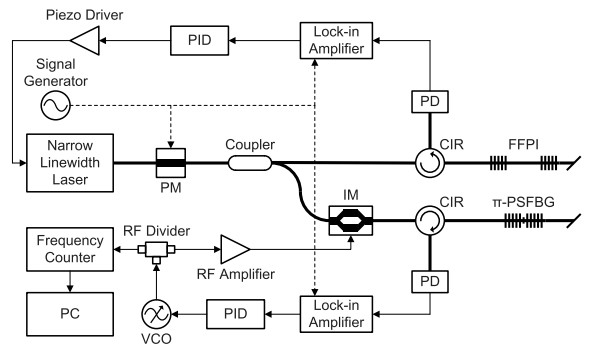 如下圖所示為雙穩(wěn)頻反饋環(huán)路光纖應(yīng)變傳感器,該傳感器頻率范圍可以從準(zhǔn)靜態(tài)到幾百赫茲,由用于應(yīng)變傳感的π相移光纖布拉格光柵和作為參考的光纖法布里-珀羅干涉儀組成。系統(tǒng)使用Pound-Drever-Hall技術(shù)來產(chǎn)生誤差信號(hào),激光載波和邊帶分別通過兩個(gè)獨(dú)立的反饋回路鎖定到參考元件和傳感元件。其應(yīng)變分辨率在0.01-250Hz的帶寬內(nèi)具有出1/f的特性,在10Hz的頻率下應(yīng)變分辨率優(yōu)于0.01nε,動(dòng)態(tài)范圍高達(dá)149dB。與傳統(tǒng)的靜態(tài)應(yīng)變傳感器相比,這種傳感器在分辨率和傳感帶寬方面都有很大的提高,可以成為地球物理研究應(yīng)用中的有力工具。