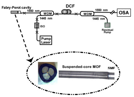 在溫度傳感方面,如下圖所示為一種基于法布里-珀羅混合腔和隨機(jī)鏡組合的光纖激光溫度傳感器,法布里-珀羅混合腔是由單模光纖與一小段懸浮芯光纖熔接構(gòu)成,隨機(jī)鏡是由多個(gè)瑞利散射沿著色散補(bǔ)償光纖傳播時(shí)產(chǎn)生的,是光纖中拉曼增益的直接結(jié)果。在該結(jié)構(gòu)中法布里-珀羅腔同時(shí)具有激光反射鏡和溫度傳感腔兩個(gè)功能。該光纖激光溫度傳感器在 15nm的波長范圍內(nèi)最大輸出功率大約為4mW,同時(shí)可以在200℃的測量范圍內(nèi)溫度靈敏度達(dá)到約6pm/℃。