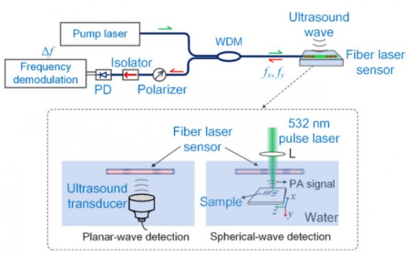 如下圖所示為一種用于聲波探測的高頻光纖激光傳感器,超聲波能夠使光纖激光腔發(fā)生形變,引起外差輸出信號(hào)的頻率變化。傳感器在22MHz處發(fā)生頻率響應(yīng),其寬帶聲學(xué)傳感靈敏度為2.25MHz/kPa,當(dāng)采樣率為100 MHz時(shí),噪聲當(dāng)量壓力達(dá)到45Pa。其針對(duì)球面波的檢測帶寬達(dá)到18 MHz。沿光纖縱向的靈敏度隨激光空間模式而變化,并由光柵和腔這兩個(gè)參數(shù)決定。在徑向方向上,靈敏度與聲源和檢測器之間的距離的平方根成反比。通過減小腔的長度可以增強(qiáng)聲學(xué)靈敏度,短腔可以顯著提高傳感器的光生顯微鏡(PAM)對(duì)比度和穿透深度。